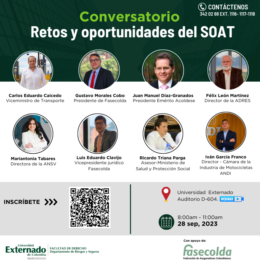 El jueves 28 de septiembre se llevará a cabo en la Universidad Externado el conversatorio ‘Retos y Oportunidades del Soat’. El evento, organizado por la Universidad y apoyado por Fasecolda, contará con la participación del presidente del gremio, Gustavo Morales; el vicepresidente jurídico, Luis Eduardo Clavijo, entre otros.